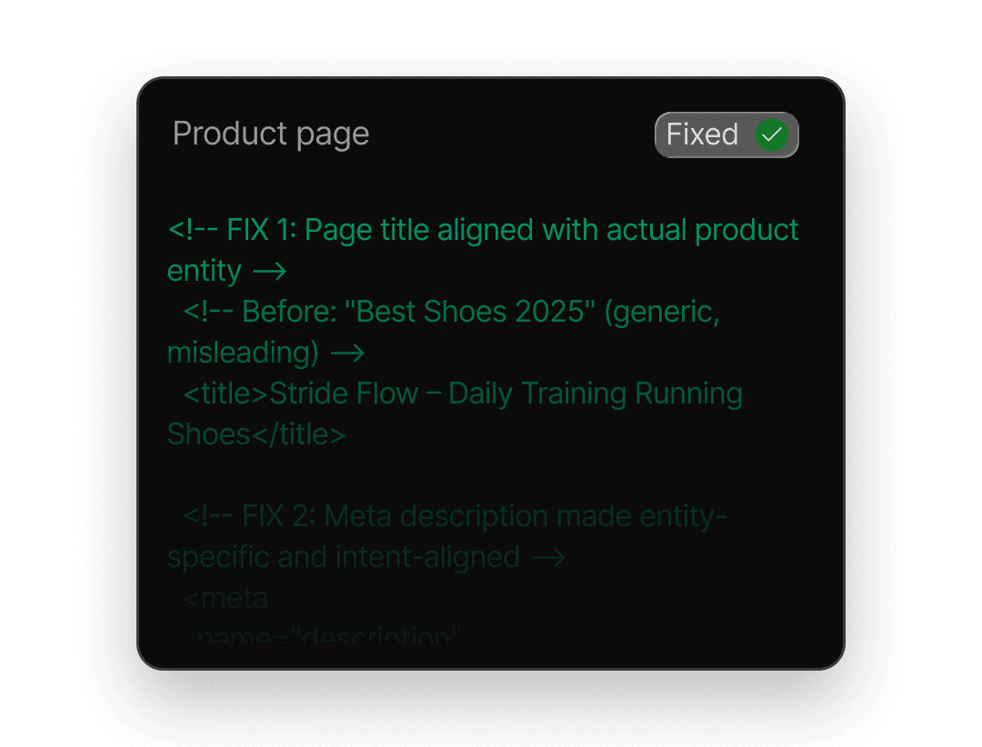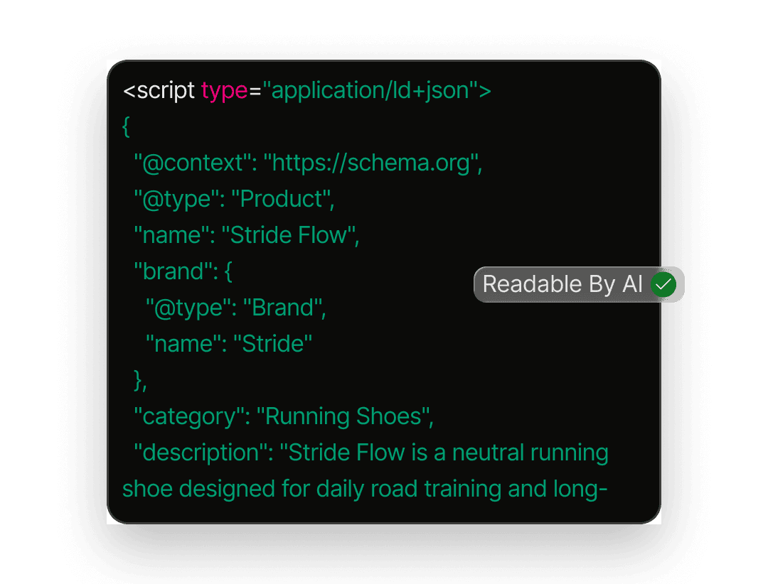 ThirdEye analyzes how AI models parse your system’s structure, entities, schema, and metadata, then provides implementation-level guidance to fix AI readability and discovery issues across your product.