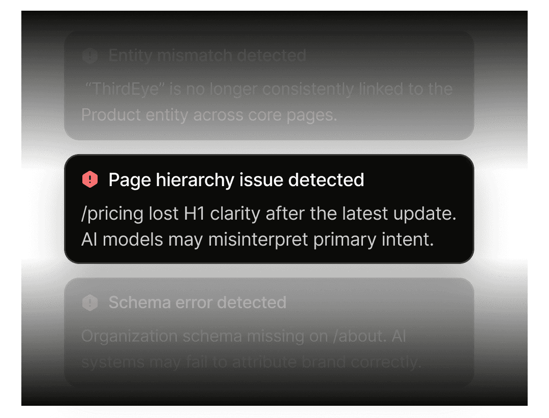 ThirdEye analyzes how AI models read your pages, structure, entities, schema, and metadata, then highlights exactly where interpretation breaks so developers can fix AI visibility issues with precision instead of guesswork.